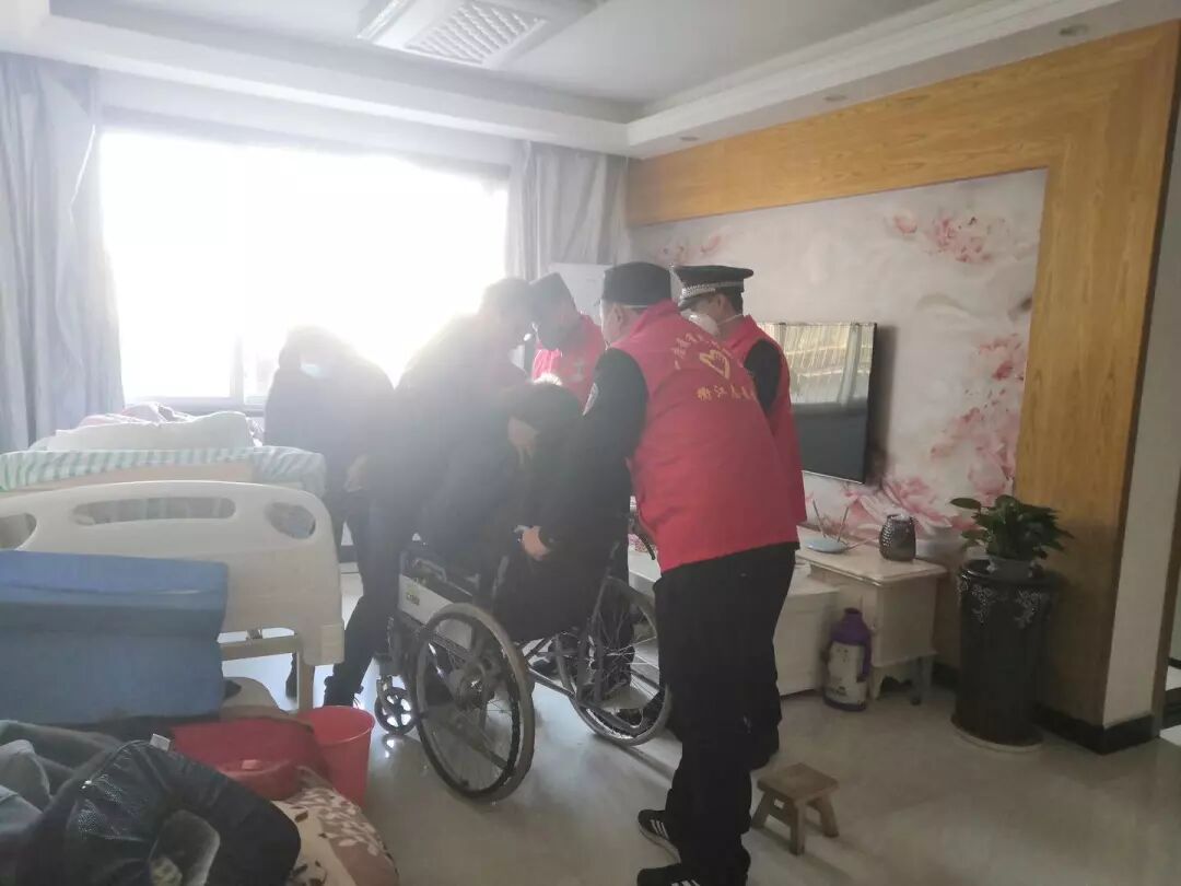 赶到现场时,求援群众一家三人已做好防疫措施,队员们上前帮忙把老人抱到轮椅上,做好安全防护后开始抬运。